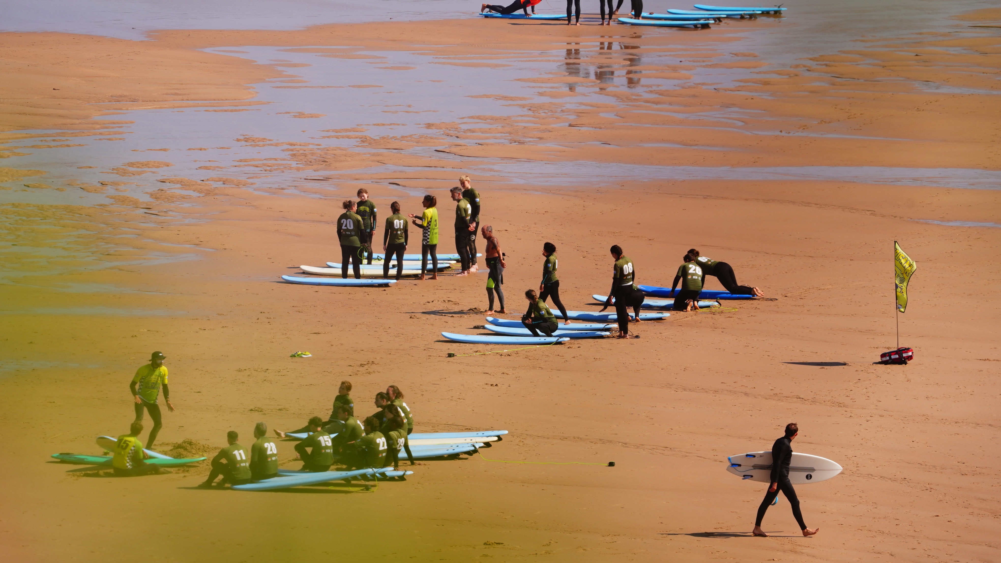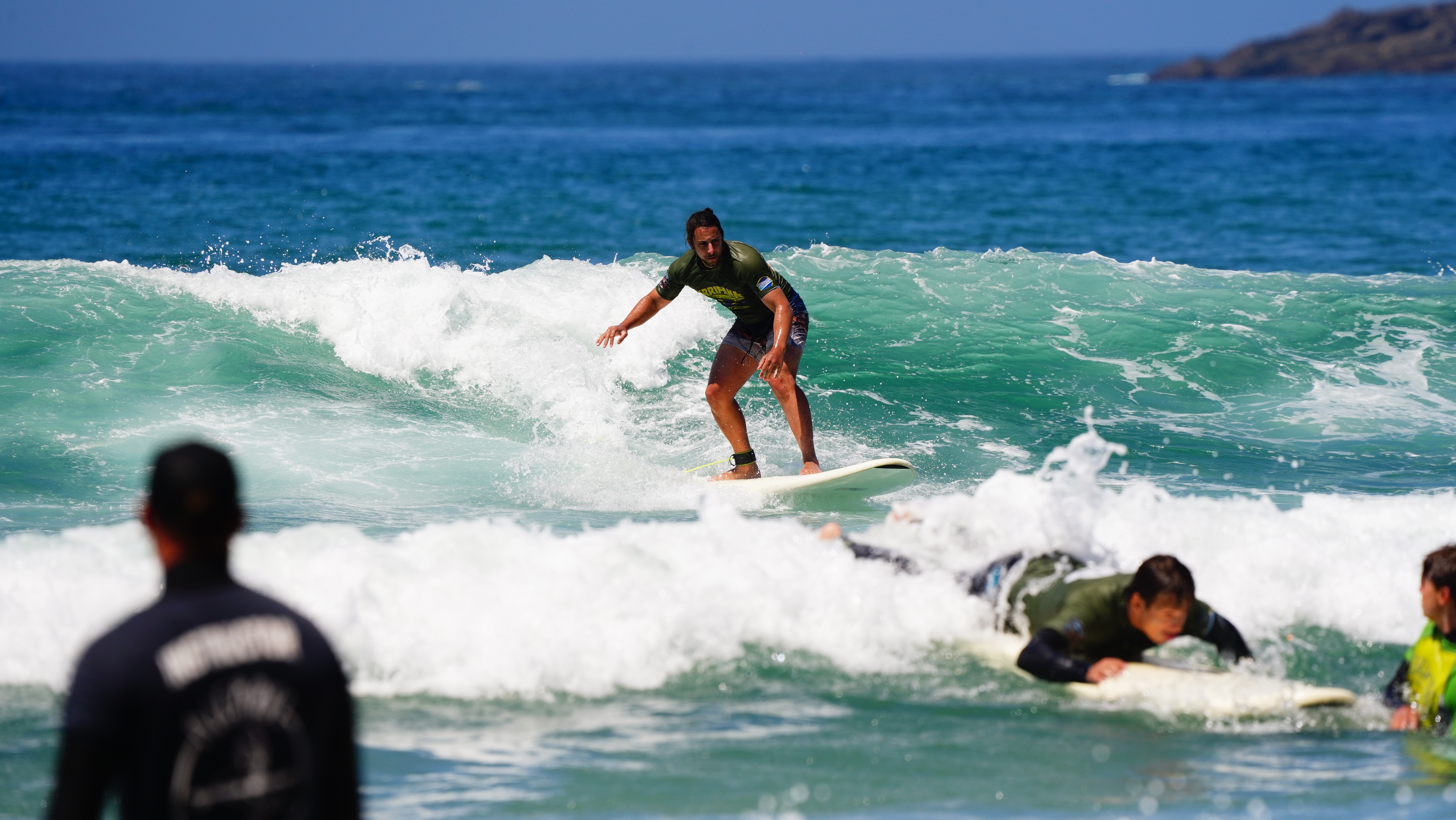 In the beginning you practice the technique to stand on the board just on the sand. Then, you work with the instructors to stand on the broke white waves
